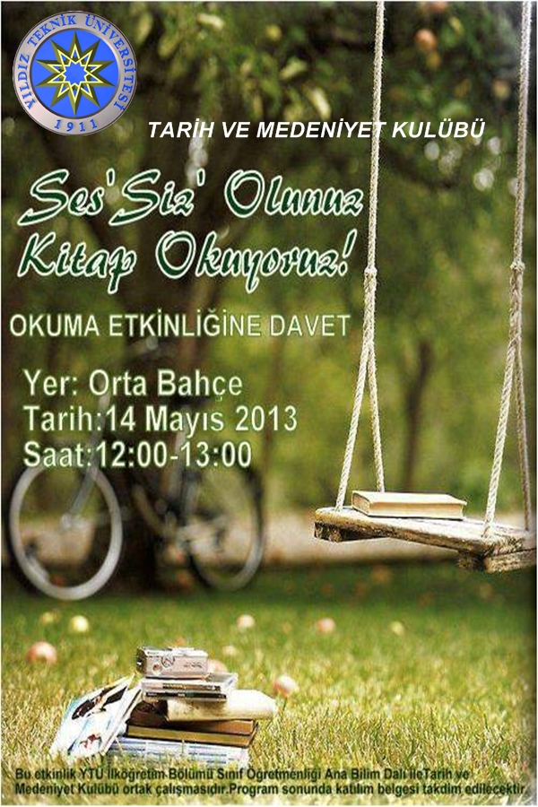 Sınıf Öğretmenliği Ana Bilim Dalı ve Tarih ve Medeniyet Kulübü’nün ortak çalışması olarak, 14 Mayıs 2013 Salı günü 12:00-13:00 arası, orta bahçede gerçekleştirilecek olan kitap okuma etkinliğimize tüm öğretim elemanlarımız ve öğrencilerimiz davetlidir.