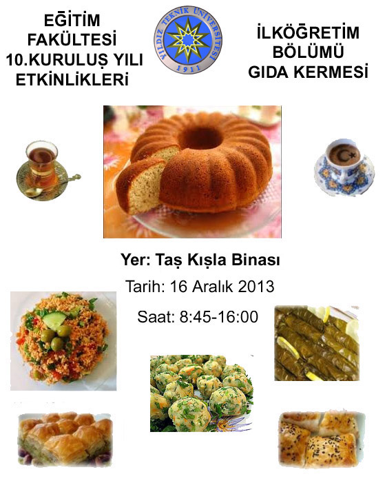 Fakültemizin 10. kuruluş yıldönümü etkinlikleri kapsamında 16 Aralık pazartesi günü 08:45 ile 16:00 arasında Kermes düzenlenecektir. Sunulanacak ürünler bizzat öğrencilerimiz tarafından yapılacaktır. Geliri öğrencilerimiz için kullanılacak bu güzel etkinliğe tüm Yıldız camiası davetlidir.